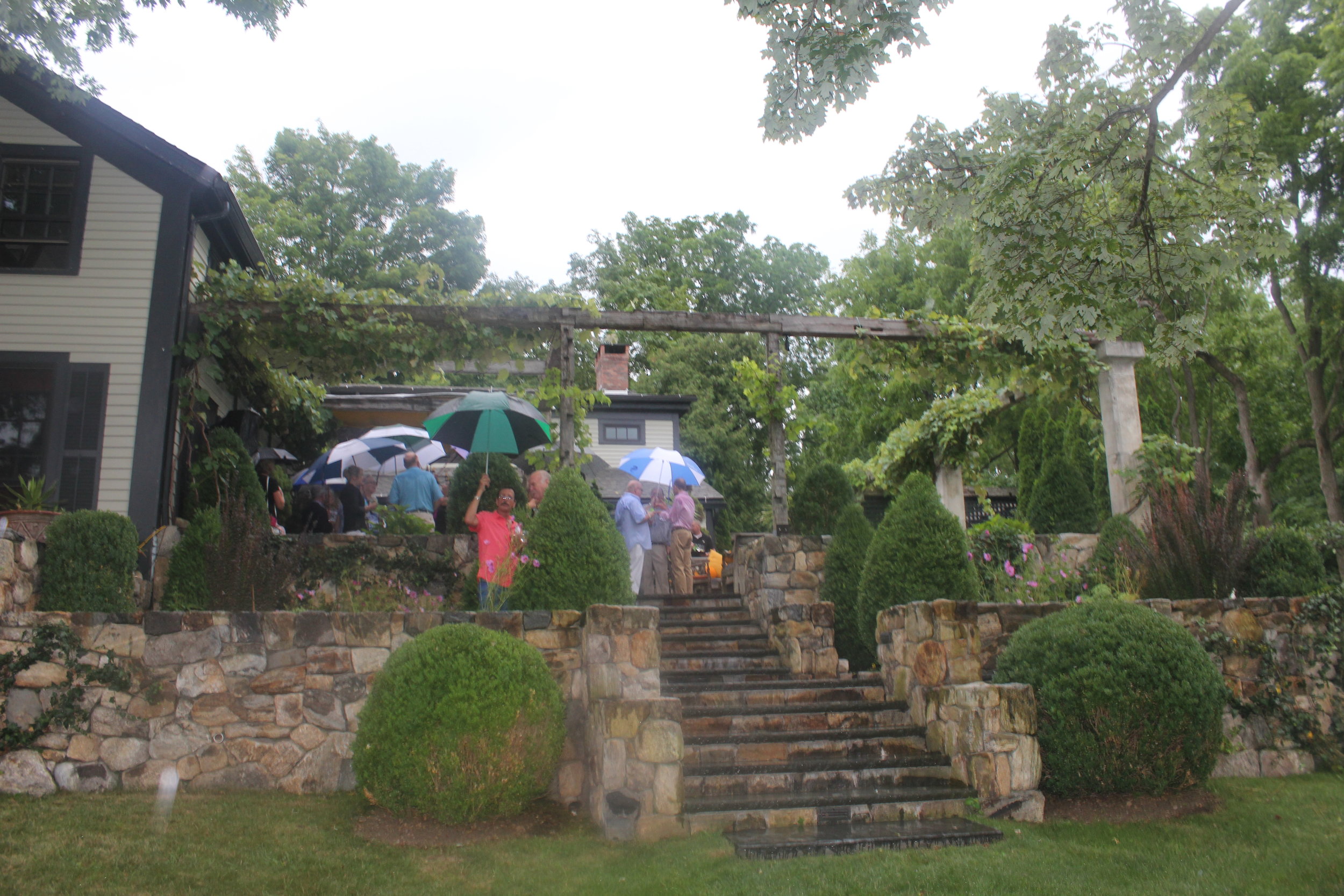 A little rain did not dampen the festivities at our 2016 annual Garden Party held on July 30th at the Sharon home of Michael Trapp, the renowned landscape designer and antiques dealer. Guests strolled through Michael's classic formal gardens – replete with surprising vignettes. Beyond the front door a surprise: a reflecting pond, with a fountain, for shiny goldfish! Off the living room: a romantic grape arbor supported by 17th century columns. The magnificent terrace decorated with a variety of interesting pots and Michael’s trademark teak furnishings from the Far East. Out back, a relaxing pool, also with a fountain – this one for people! Many thanks to our wonderful host for providing such a beautiful setting!