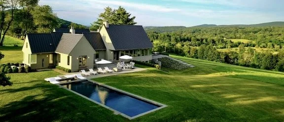 This year’s event brings us up a long winding driveway through dancing fields of hay to a hilltop modern home first built in 1974. It was expanded and transformed in 2010 by NYC architects Mcgiver-Morgan. The focus is the view - sitting atop 58+ acres with 360-degree views reaching both New York State to the West and Massachusetts to the North. The house sits amidst a mix of open fields and light woods. Mother nature rules the view and the landscape - huge lawns & boxwood dominate the immediate surrounds. Dramatic and modern open floor-plan living space turns out to large terraces, fire pit and an elongated pool with hot tub. Lush green lawns afoot and the scent of lavender in the air. Sit under the oak tree decorated with a large American flag or saunter on mowed paths through rolling fields and woods that continue down to the rushing waters of the Webabuck River.