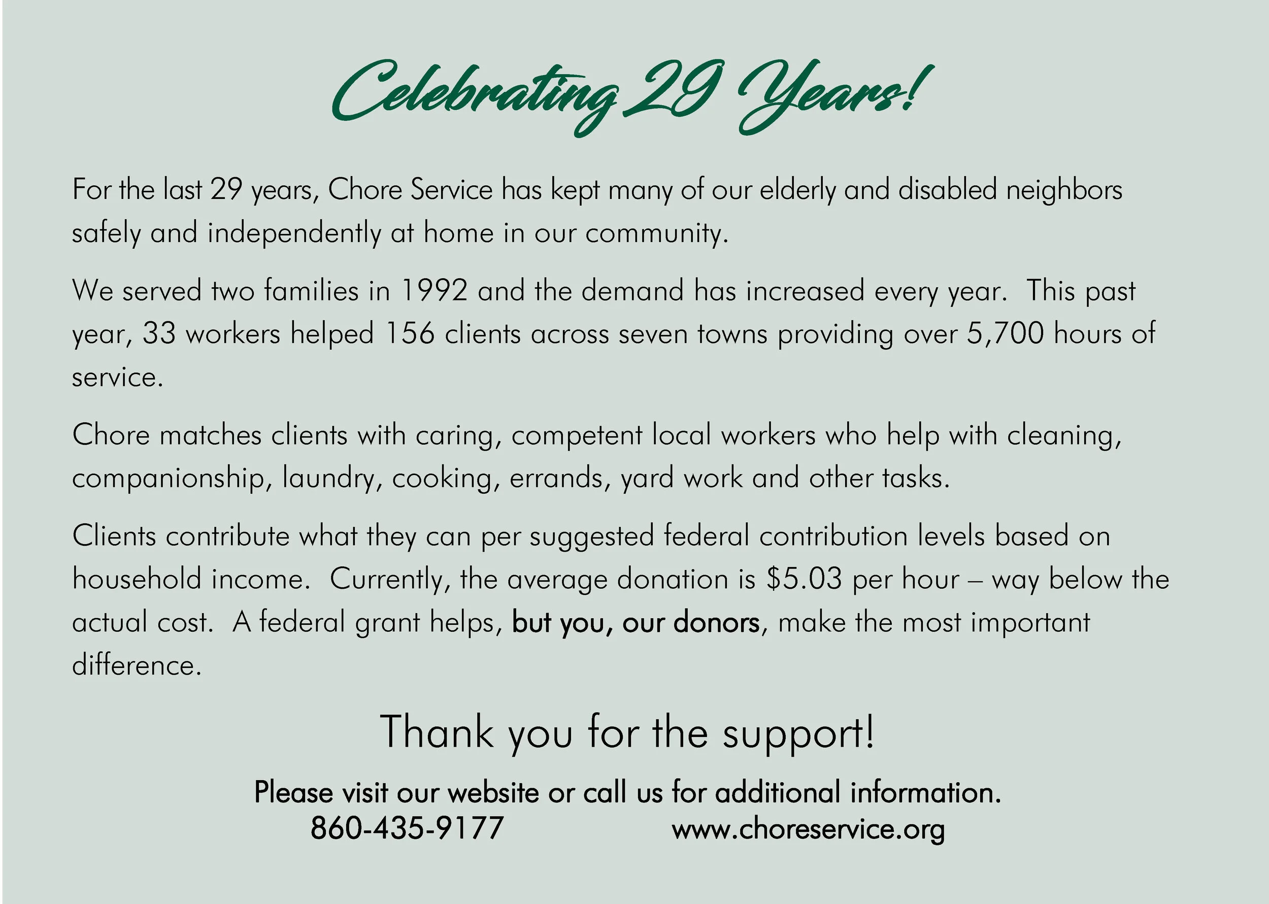 Today we ask you to consider joining them by contributing at one of the seven sponsorship levels or make a non-sponsor donation so that we can best support our Chore clients.