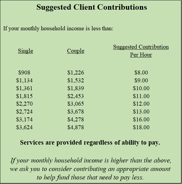 Chore Service is partially funded by a grant from the Western Connecticut Area Agency on Aging. These monies subsidize all clients aged sixty and over, regardless of income. Clients make a donation based on monthly household income and ability to pay (see below for suggested guidelines). Since Chore Service receives only partial funding from the Western Connecticut Area Agency on Aging for those 60 and over, contributions are very important to help us cover our remaining costs. Client contributions supplement our grant along with donations from towns, churches, charitable foundations, and donors so that the program can remain affordable for everyone.